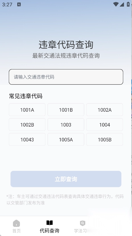 2. 在代码查询页面输入交通违章代码,就能快速查询到违章信息。