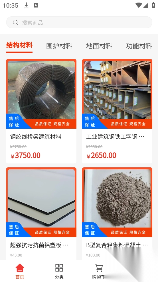 1. App拥有极为丰富的商品品类,涵盖结构材料、地面材料、围护材料等多种类型的优质产品。用户能够便捷地找到自己所需的各类建材钢材,充分满足多样化的产品采购需求。