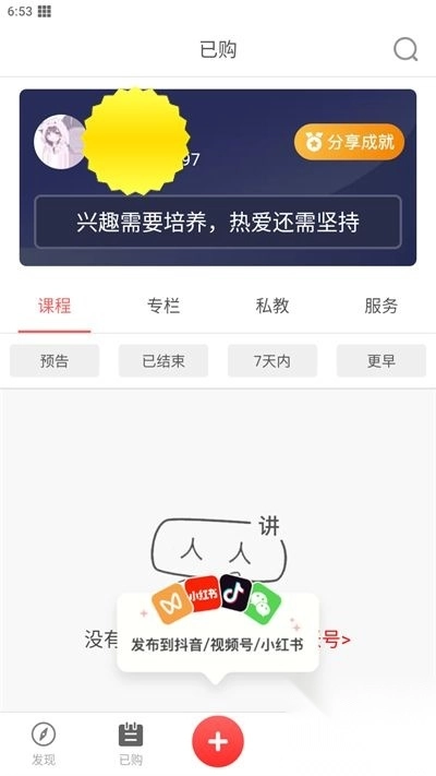 4、点击已购选项还能查看自己购买的课程,还有专属的私教服务可以获取