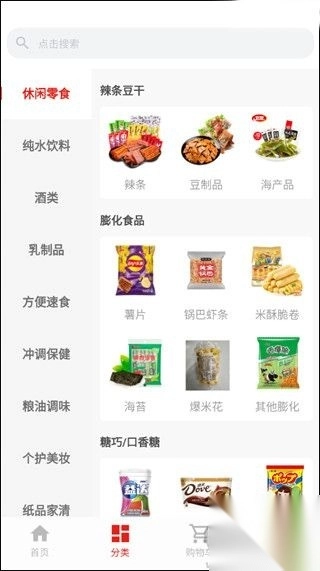 2、用户能够依据自身喜爱的方式在分类里挑选,无论是购买休闲零食,还是生鲜食材,在此都有明确划分。