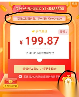 助力次数达到限制后可以通过“红包雨”和“整点领现金”来获得现金,促使更快的达到提现金额!和最开始的分享同样的道理,并不用真的分享,跳转到微信界面后,点击返回就可以了!