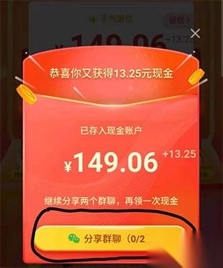 3、然后就会看见增加了不少的现金,紧接着会继续叫你分享到群,和上一个分享同样的道理,并不用真的分享,跳转到微信界面后,点击返回即可!