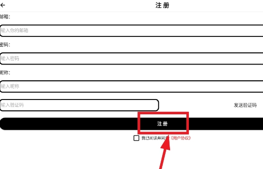 4. 填入您的邮箱、密码、昵称以及验证码,同时勾选用户协议,接着点击“注册”按钮,以此完成注册流程。