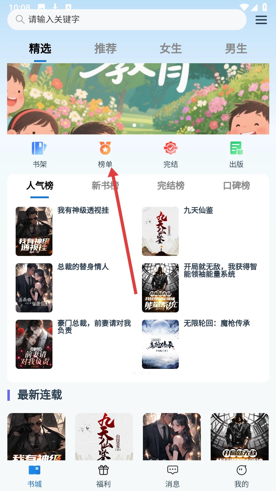 1、书城页点击【榜单】,进入小说排行榜页面。