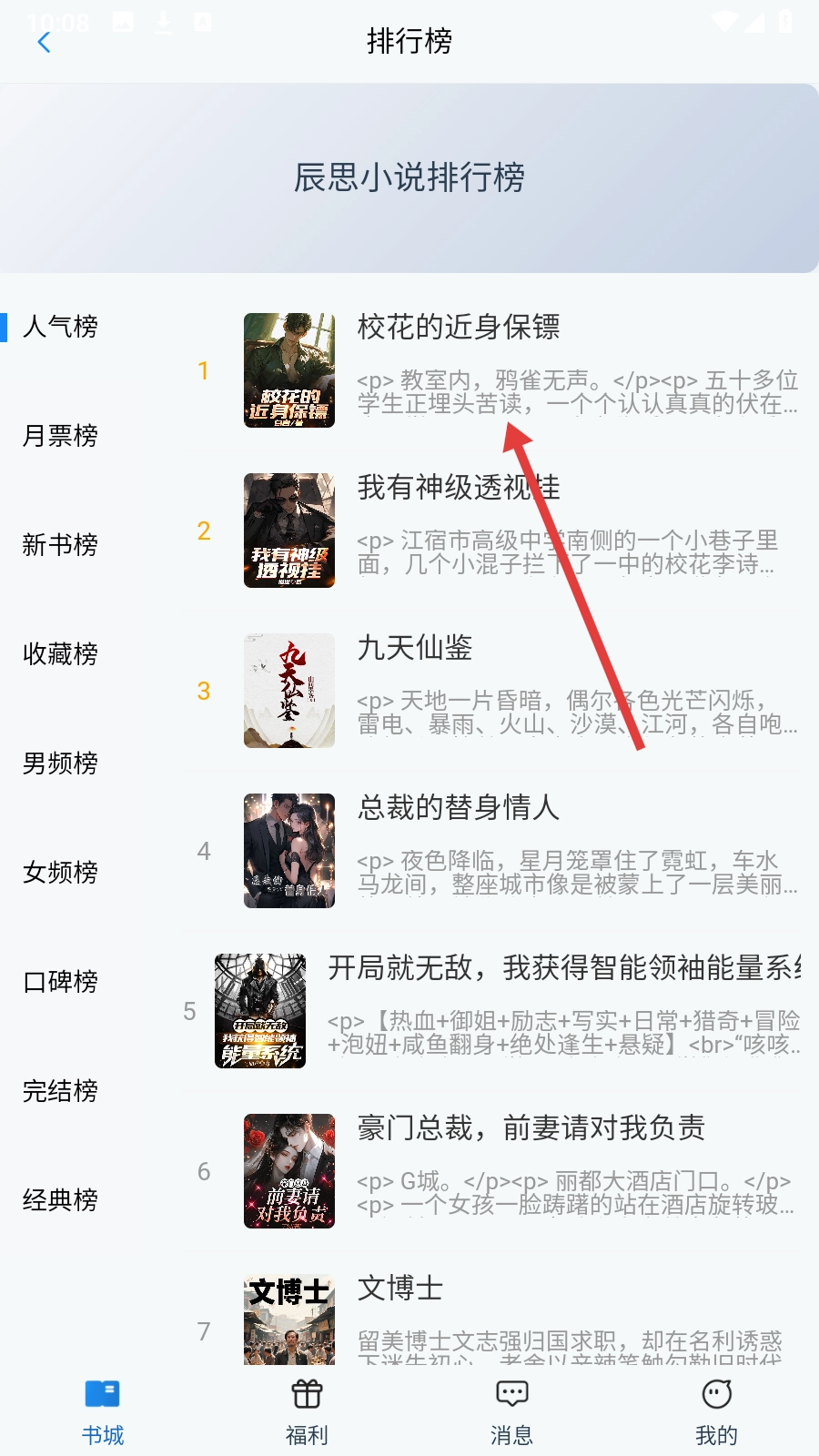2、排行榜选择【喜欢的小说】,进入小说详情页。