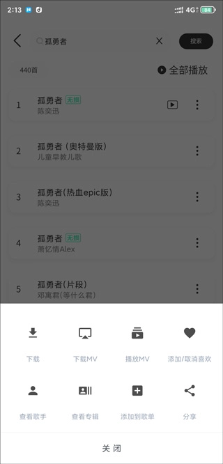 3、搜索完后,点击歌曲右边三个点,就可以下载、播放、添加喜欢等操作。