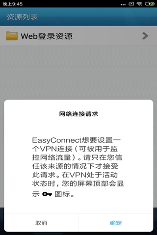 4、完成验证后,系统将自动返回EasyConnect资源列表页面,同时状态栏会显示VPN连接状态。