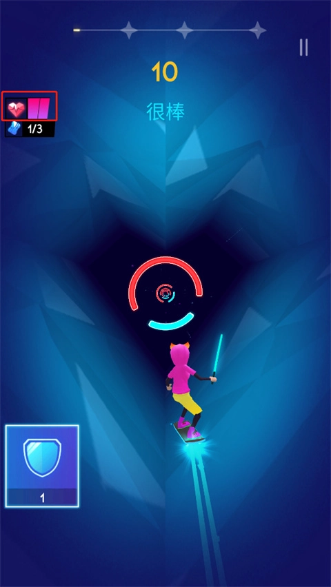 5、玩家若碰到带有颜色的光环,就得留意了。此时,玩家需要击打的颜色会产生变化,而这个击打的颜色正是光环的颜色。