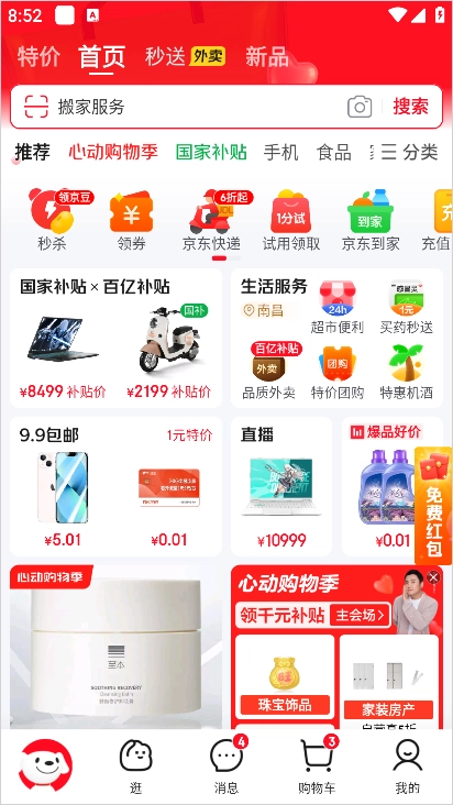 1. 京东搬家属于京东App内的一项功能,因此我们直接在上方搜索框中搜索【京东搬家】。