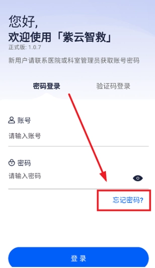 下载安装并打开紫云智救APP,进入登录界面后点击忘记密码;