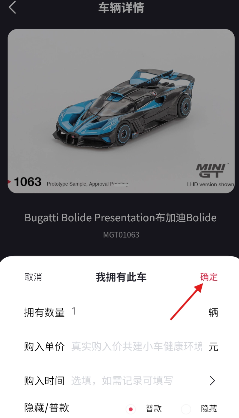 4、在弹出的信息填写框中,补充完整购车时间、价格、款式等详细信息,检查确认没有错误后,点击“确定”,完成添加操作。