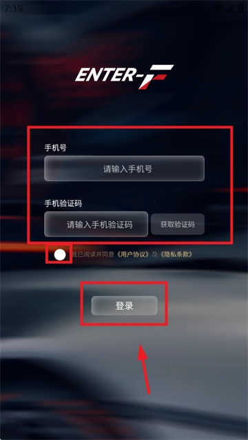2. 当进入登录界面时,在相应位置输入手机号和验证码,同时勾选“我已阅读并同意《用户协议》及《隐私条款》”,最后点击“登录”按钮即可完成操作。