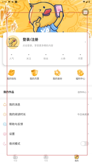 3、进入【我的】页,点【登录/注册】后,可管理钱包、消息、阅读时长等。