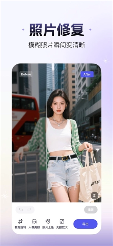 在“照片修复”功能中,用户能够选择上传图片,也可以直接拍摄图片。美片会自动对这些图片进行高清放大处理。此外,用户还可以自行对图片进行裁剪、运用滤镜美颜、实现无损放大以及上色等操作。