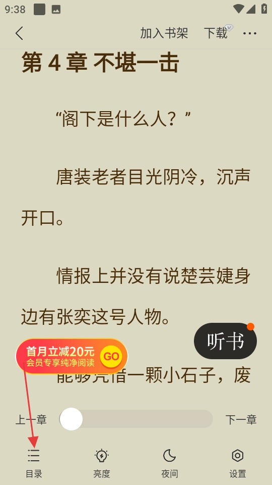 2、切换至听书模式:进入阅读页面后,轻点屏幕中央,调出功能栏,找到“听书”按键并点击,就能开启听书模式。在听书界面,还能够对语速、音量等参数进行调节。