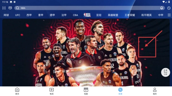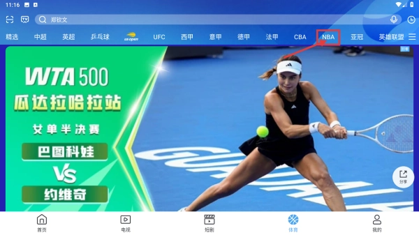 2. 在体育页面中,轻点顶部的NBA分类标签,即可浏览NBA相关的体育内容。