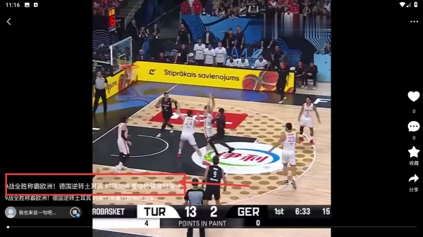 4、于赛事视频播放页面,观看诸如德国逆转土耳其之类的男篮欧锦赛赛事视频。