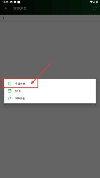 3、进入文件浏览界面后,点选手机存储选项,进而查看手机存储中的文件目录。