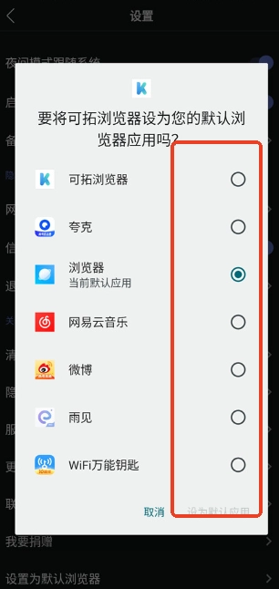4、于“设置”页面中挑选“设置为默认浏览器”。