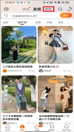2. 当您进入逛逛页面,在页面顶部找到并点击【视频】选项,即可进入短视频页面。