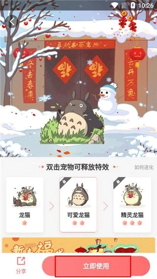 3、选中宠物后,进入详情页面,点击“立即使用”,就能把宠物添加到桌面,同时会自动激活相应的动画与互动效果。