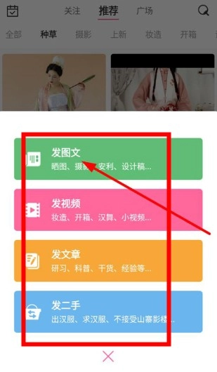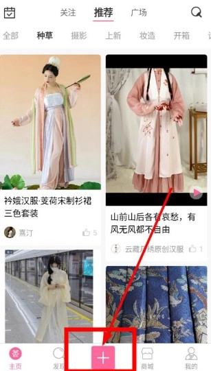 打开汉服荟并进入主页,便能查看种草、上新、开箱、妆造等相关内容。
