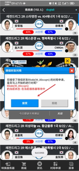 4、点击之后,系统会自动登录弈城围棋App,随后点击接受按钮。