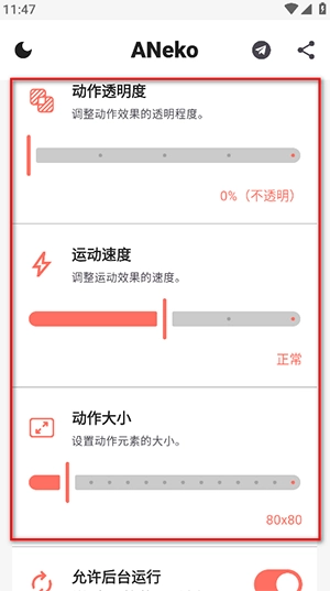 5、向下滑动,按照个人喜好对动作透明度、运动速度以及动作大小进行设置。