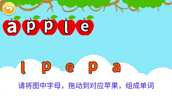 3、其教学方式为,首先学习26个英文字母。以学习第一个字母a为例,在听清楚英语单词后,就能够把图中的字母放置到相应的位置上。