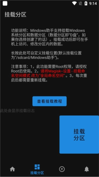 Mindows助手能够挂载Windows系统分区以及数据分区(比如D盘)。一旦挂载成功,您便能在手机上对这些分区里的数据进行访问与修改。但要注意,此功能需要root权限,而且每次重启后都得重新挂载。