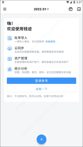 1、当打开“钱迹”首页后,首先要登录个人账号,接着通过底部的“+”按钮唤起记账功能,以便随时记录日常收支数据。