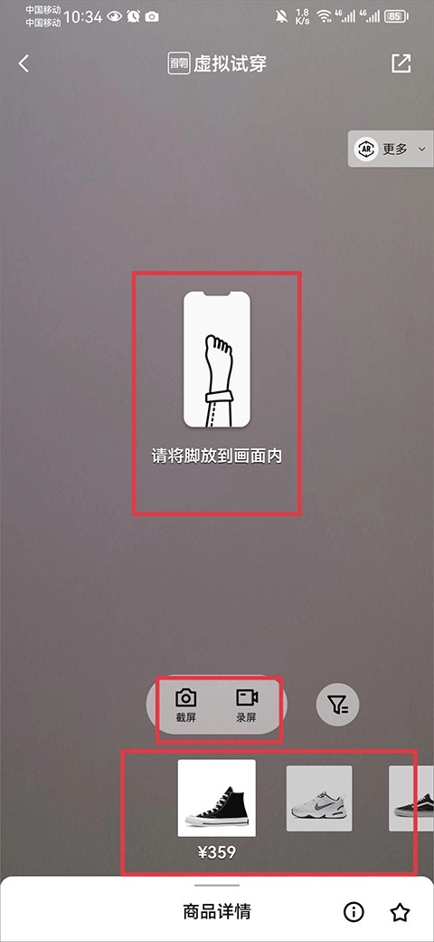 3、然后在虚拟试穿界面中,将脚放到画面内,并在下方左右切换鞋子进行试穿,满意后可以进行截屏或录屏