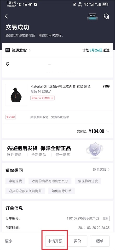 3、在订单详情界面中点击下方的申请开票