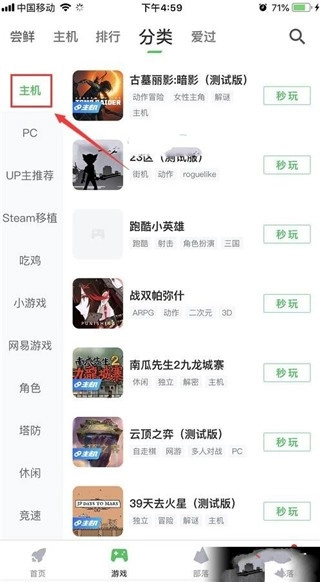 2、选择上方标注位置的分类,进入游戏分类专区;