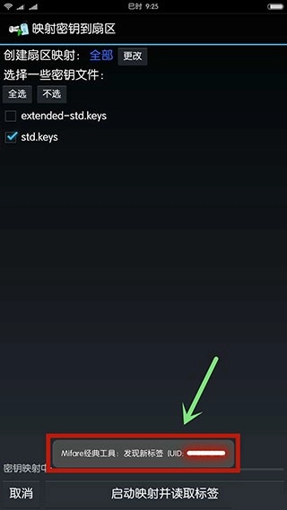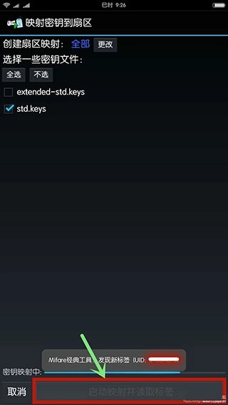 2、于MCT主界面,点击“读标签”,随后勾选密钥文件(该文件包含常用密钥),接着将原卡放置在手机NFC感应区,最后点击“启动映射并读取标签”。