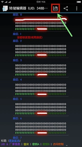 读取操作完成后,能看到如下界面,扇区0第一行的前8位即为卡号(UID) 。我们需做的便是将该卡号写入目标卡。