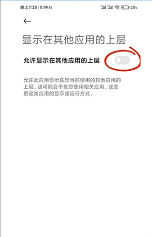 1、点击“去开启”“前往设置”可以进入悬浮窗权限开启界面,找到“在其他应用上层显示”选项,开启即可。