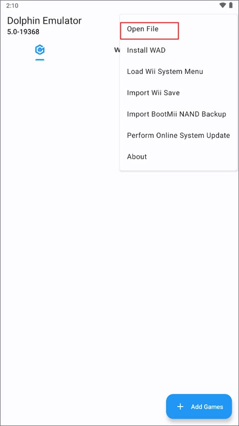 1、若想把手机上的游戏导入,第一步点击右上角三点里的“Open File”或者右下角的“Add Games” 。