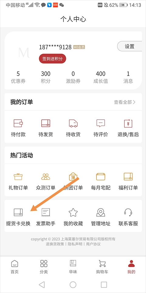 1、打开并登录莫塞尔商城,进入【我的】页面中点击【提货卡兑换】