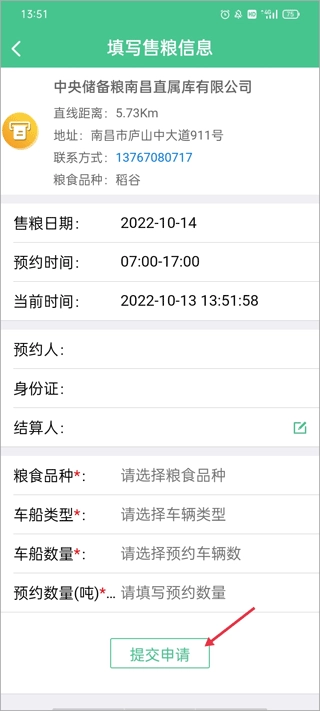 4、于上方填写所需粮食品种、车船类型等相关信息,填写完毕后点击“提交申请”,如此便能够预约到售卖的粮食。