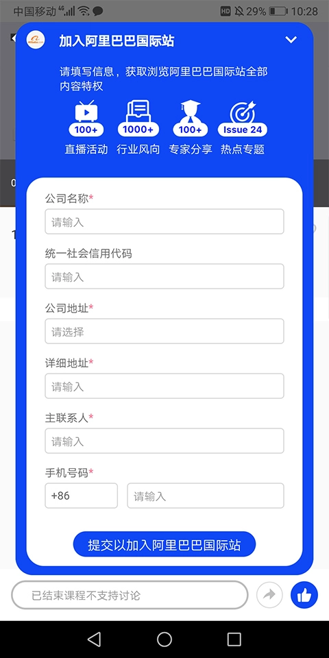 3、随后在新打开的页面里,按顺序输入公司名称、公司地址、主要联系人以及联系人手机号码,全部输入完成后,点击提交就行。