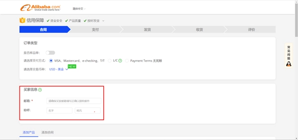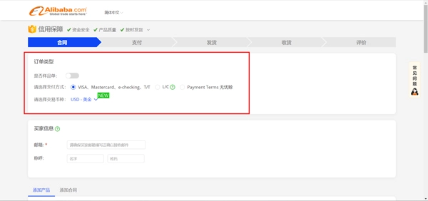 第二步:挑选是否为样品单、支付方式以及交易币种。