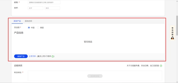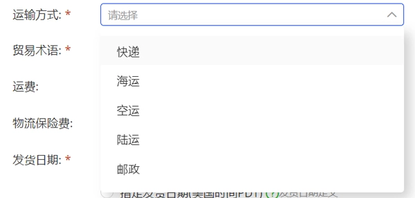 b. 运输方式:提供空运、海运、快递、陆运、邮政大小包这五种运输方式供您选择。选择具体运输方式后,会出现“运费”填写框,填写运费金额后,该费用将自动计入订单总价。