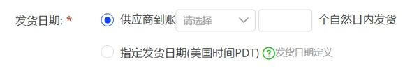 c. 发货日期:您既能够指定具体发货日期,也可选择在收齐预付款/尾款后的N个自然日内发货。(特别提醒:当您填写发货日期时,务必将周末及节假日时间计算在内,并且要填写确切的日期数字,切勿使用如about30 - 35这类表述,因为系统将按照所填范围中的最少日期来计算发货日期。)