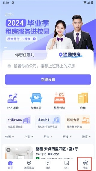 1. 第一步,打开相寓软件。进入首页后,能切换至地图找房、消息、业主、我的等页面,此时我们点击右下角的【我的】。