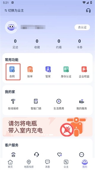2、接下来,在我的页面上,能够看到具备合同、账单、管家、身份认证等功能,此时点击【合同】。