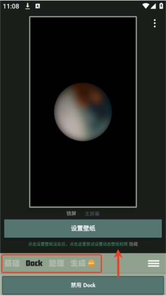 1. 进入Dock壁纸界面,在底部Dock标签处向上拉动,唤起功能页面,当前该功能页提供了四种处理方式。