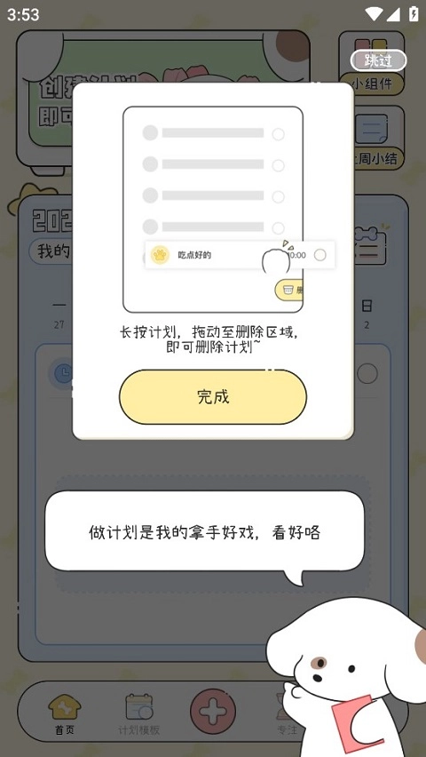 4、你能够创建多个计划。值得一提的是,在开启周计划部署期间,还能进行云端养宠。领养小狗的方式很简单,只需创建计划就行。当你完成计划列表里的任务且打卡成功后,就能领取狗粮。随着时间的流逝,狗狗的饱腹度、清洁度和健康状况会有所下降。若想让狗狗健康成长,及时打卡并完成计划才是正确的养宠方式。