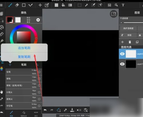 第四步,点击加号,随即会看到出现一个小框,框内有追加笔刷。