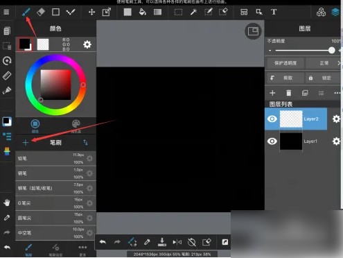 第三步,进入编辑页面,点击右上角的画笔,此时在下方就能看到笔刷,接着点击加号(参考图示)。